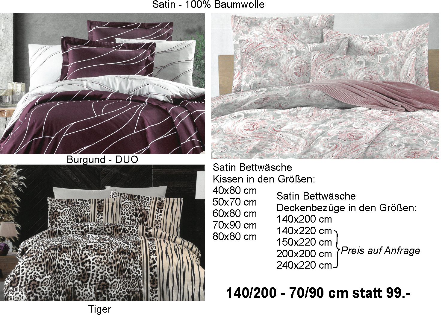 Satin Bettwäsche gemustert E-Mail 99,00 € 49,90 € Sie sparen: 49,10 € Herrliche weicher Satin! Farbe Tiger Lena Burgund-Duo Baisley Zur Wunschliste hinzufügen Produkt vergleichen Zurück zu: Satin-Bettwäsche Beschreibung Satin Bettwäsche 100% Baumwolle In den Größen: 140/200 60/80 cm 140/200 70/90 cm